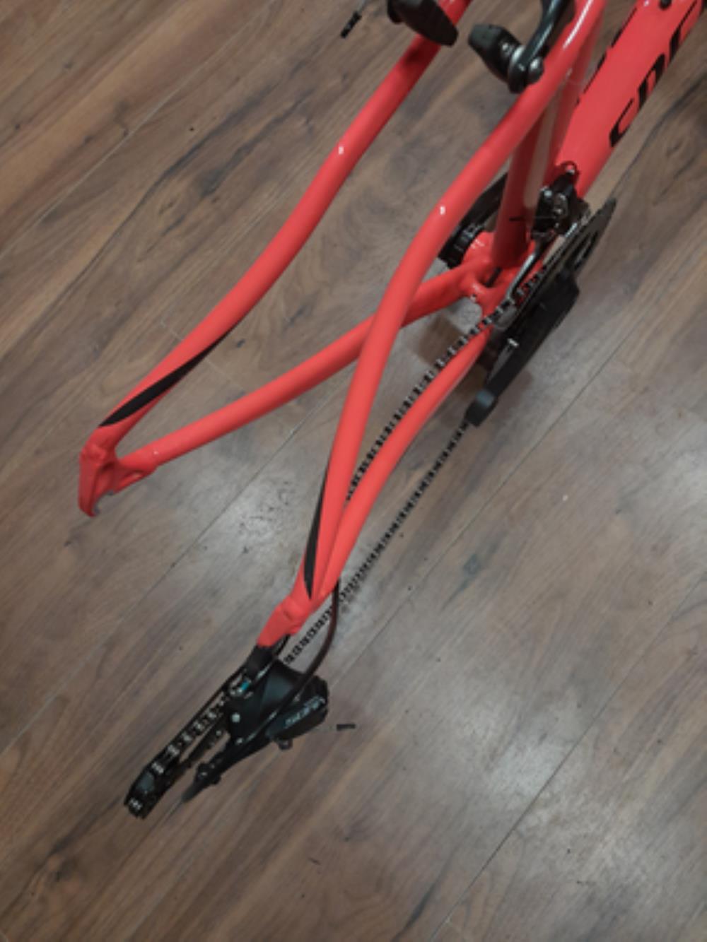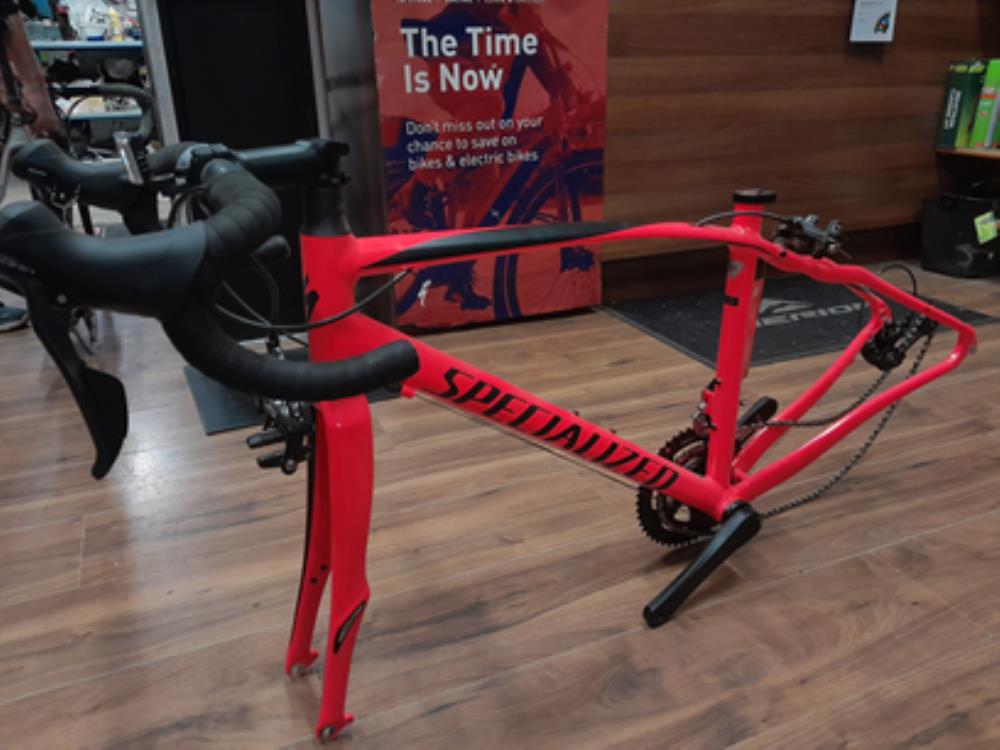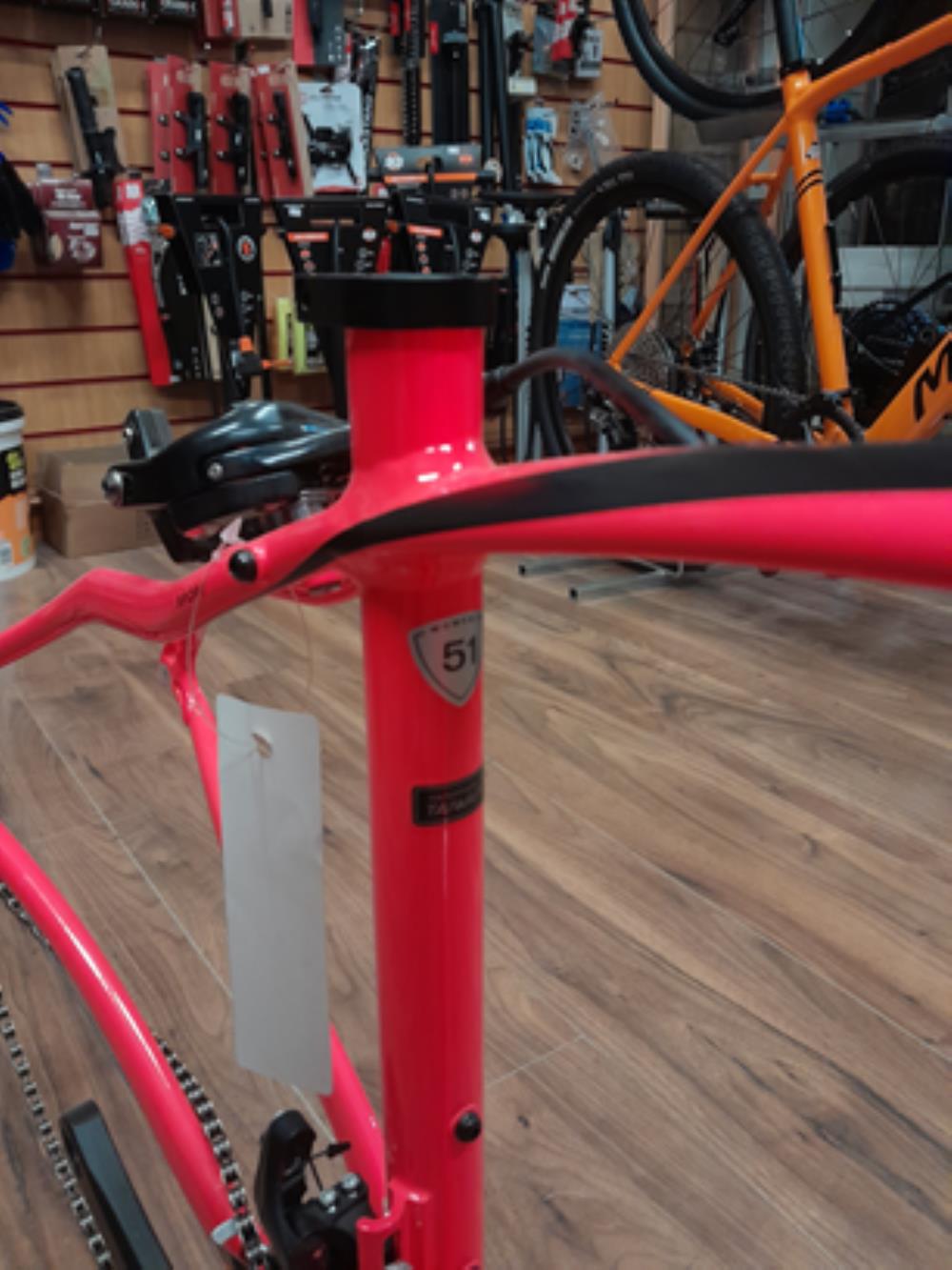 This ex demo aluminium frame just needs a set of rim wheels and a seatpost to be ridden! With a shimano sora transmission, this frame would be perfect for anyone